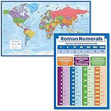 2パック - 世界地図ポスター [ブルーオーシャン] & ローマ数字 (ラミネート済み、18インチ x 24インチ)