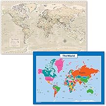 2パック – アンティークスタイルの世界地図ポスター+子供用世界地図(ラミネート、18インチ x 24インチ)